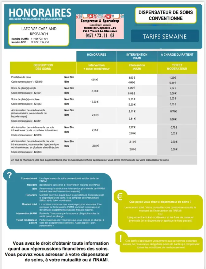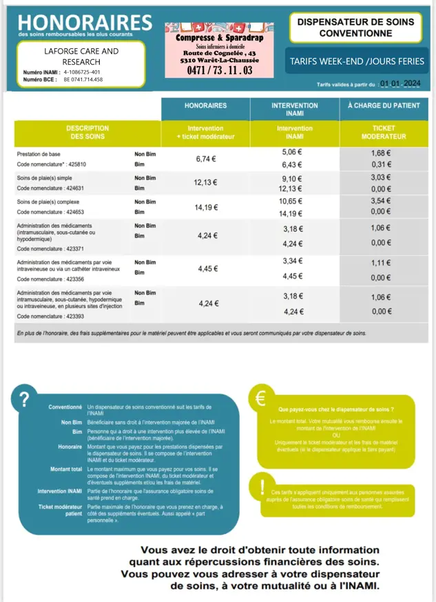 C’est pourquoi nous avons conçu une affiche grâce à laquelle vous pouvez vous informer des tarifs des prestations de soins les plus courantes.